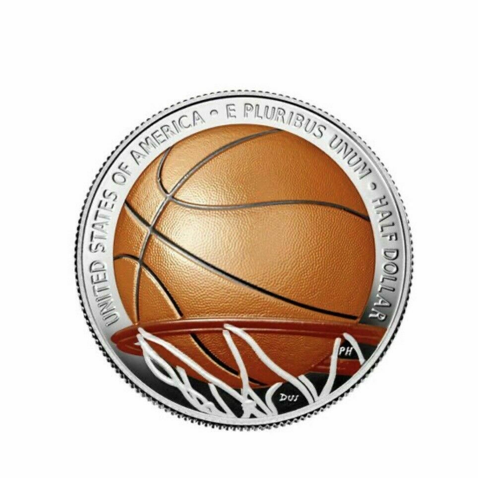 2020 BASKETBALL HALL OF FAME Este diseño representa una pelota de baloncesto naranja con canales negros a punto de pasar a través de una red blanca y un borde naranja. El baloncesto y el borde se presentan en dos tonos distintos del tono naranja familiar asociado con el deporte y el Salón de la Fama del Baloncesto Naismith Memorial. Las históricas monedas coloreadas conmemorativas del Salón de la Fama del Baloncesto de la Casa de la Moneda de los Estados Unidos son las primeras en aplicar color a sus elementos de diseño. Viene en su caja de presentación en capsula plástica sellada y con su certificado de Autenticidad.
