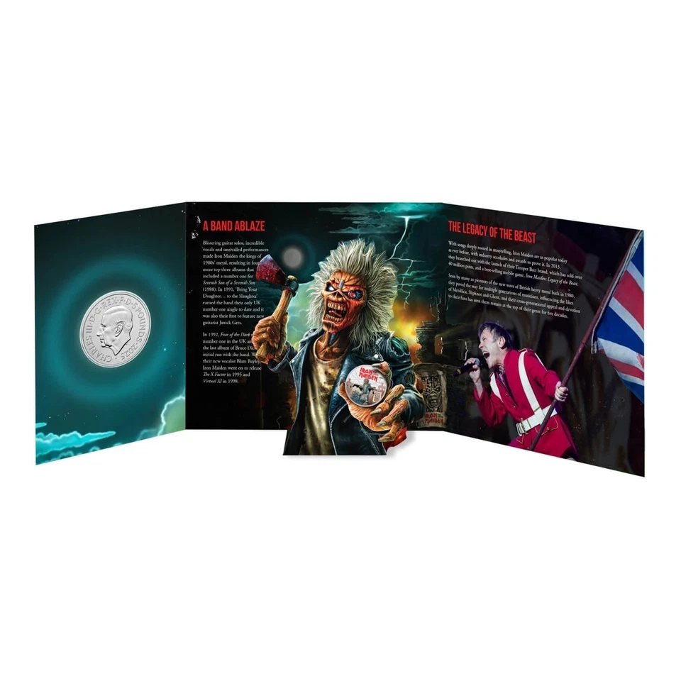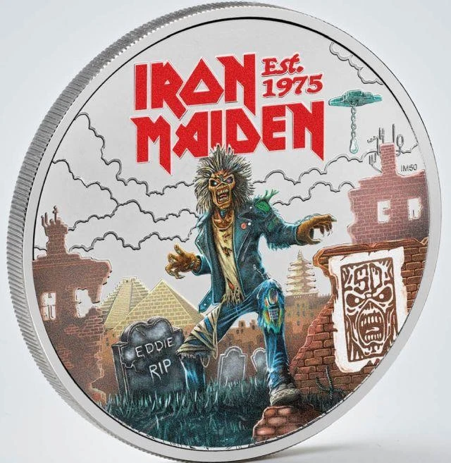 2025 DE IRON MAIDEN A COLORES DE LA ROYAL MINT, EDICION LIMITADA DE 12,500 CELEBRANDO LOS 50 ANOS. HECHA DE CUPRONICKEL, DIAMETRO DE 38.61 Y PESO DE 28.28 g DENOMINACION 5 LIBRAS. SIN CIRCULAR EN SU EMPAQUE ORIGINAL.