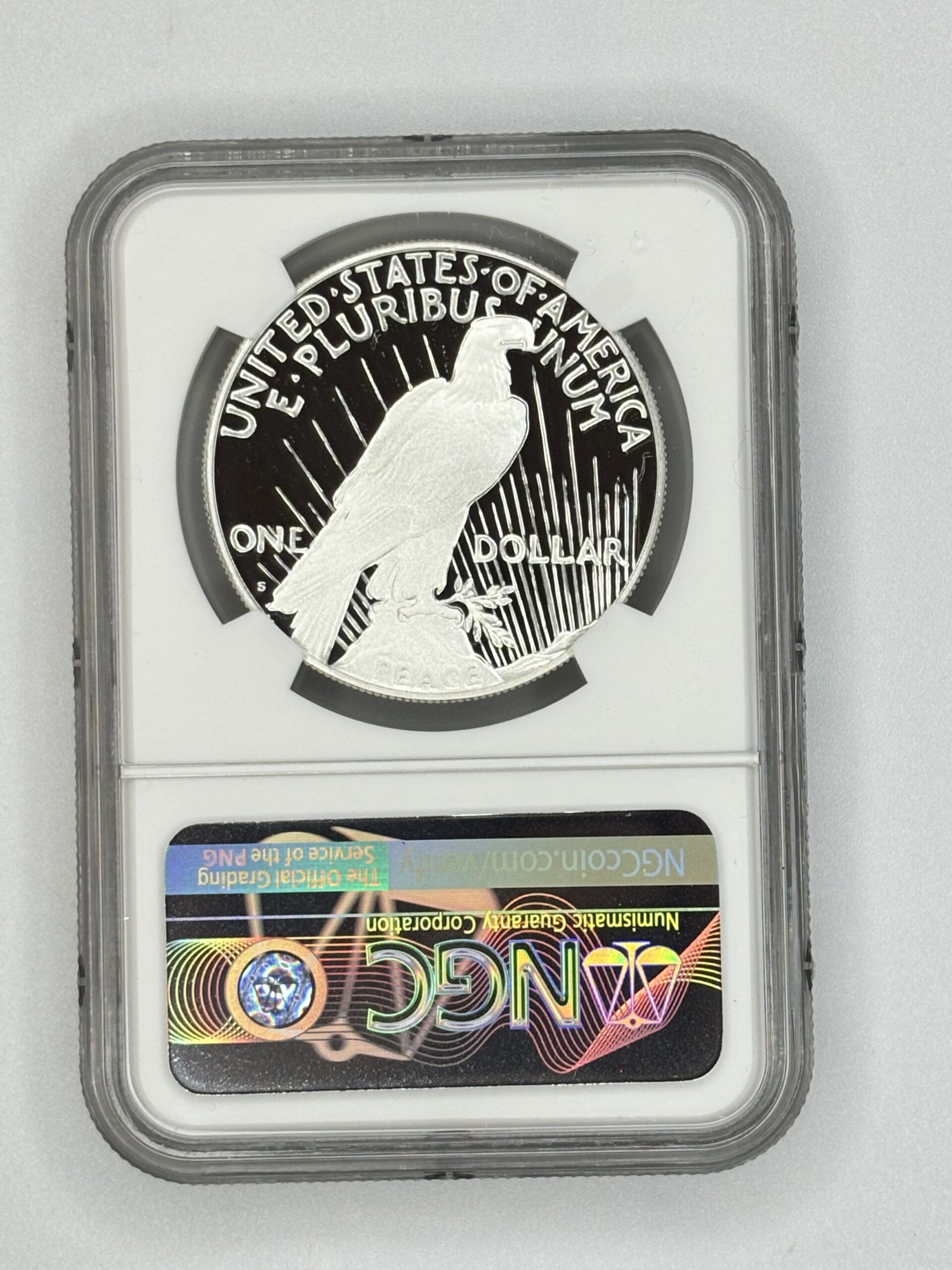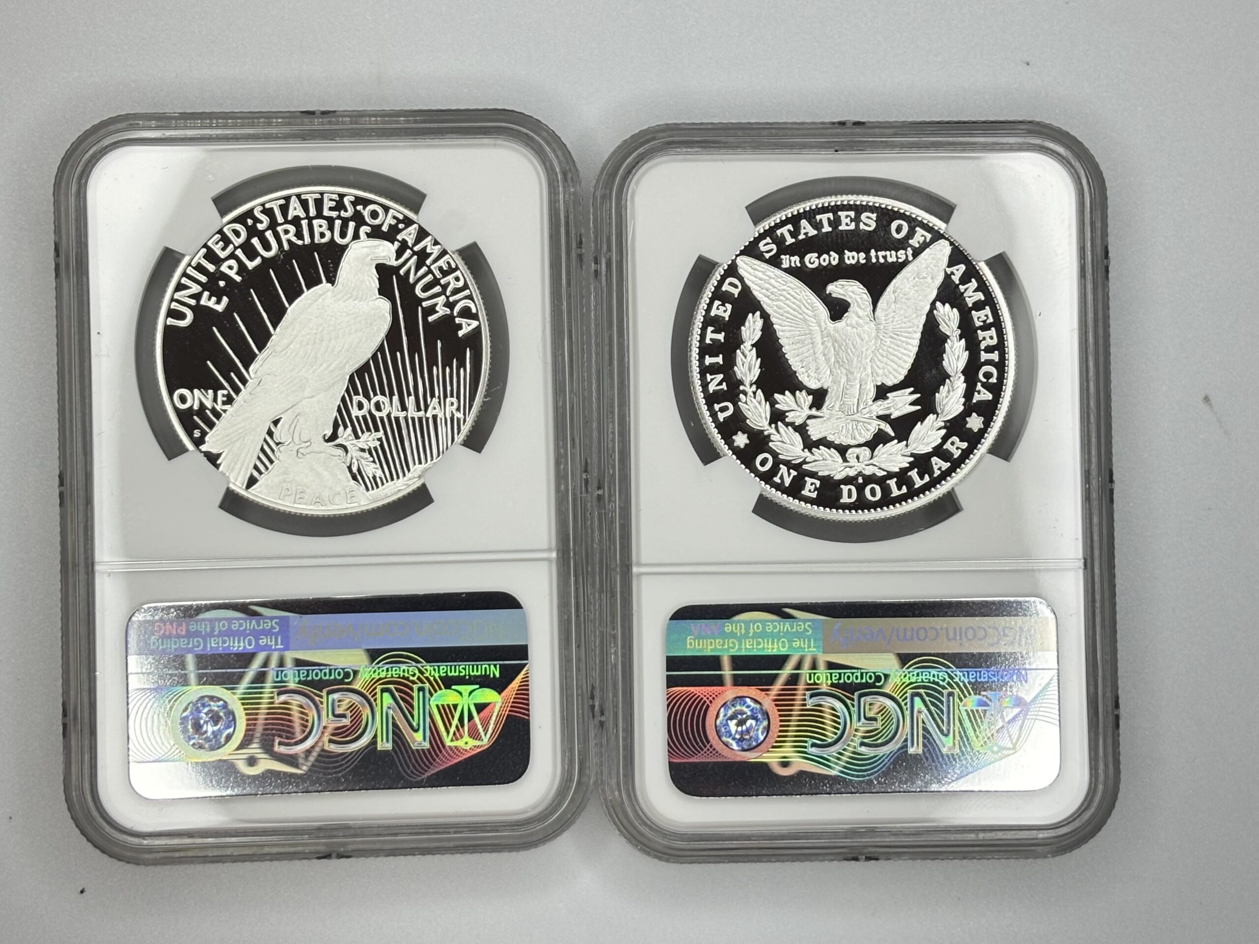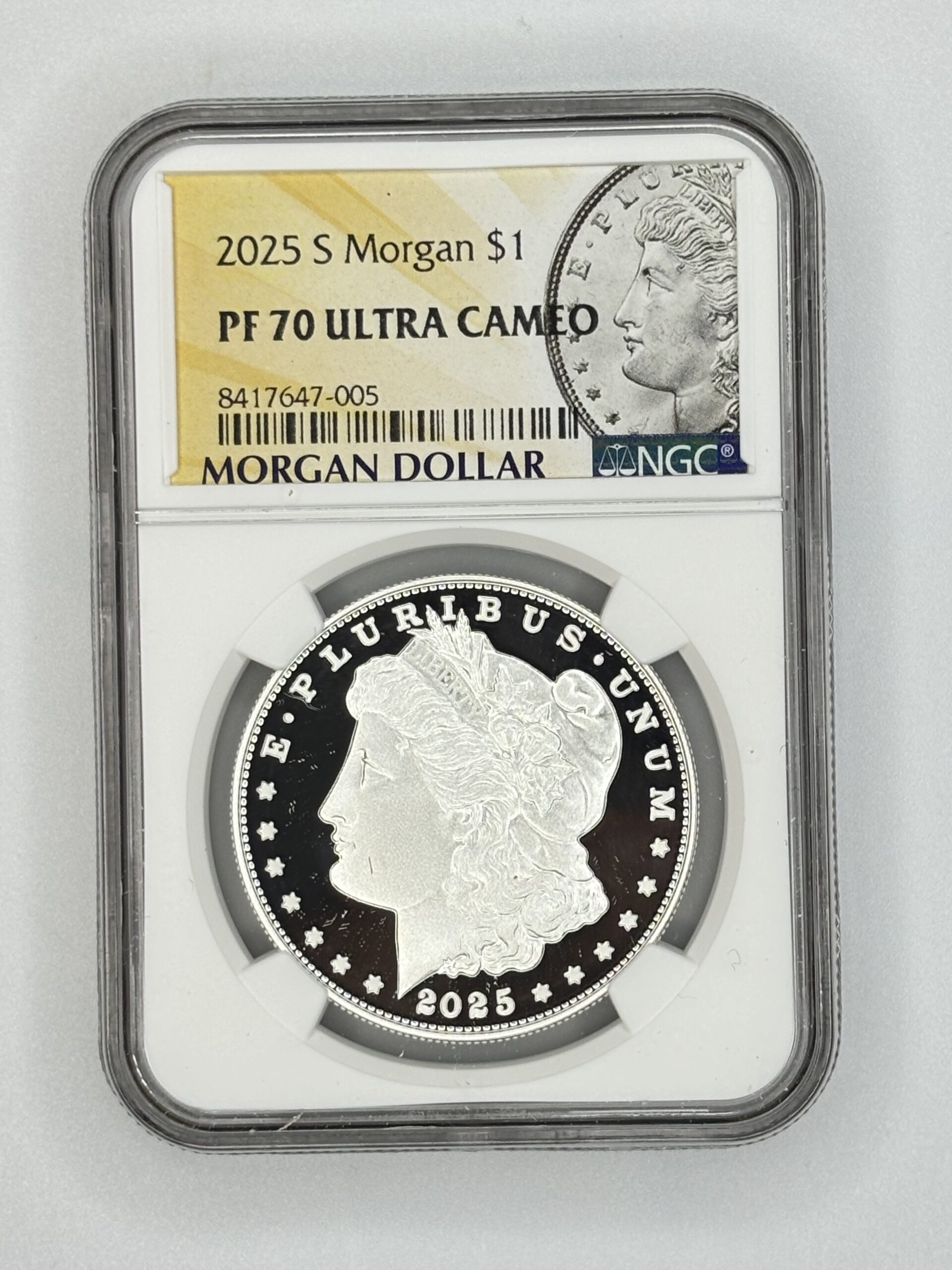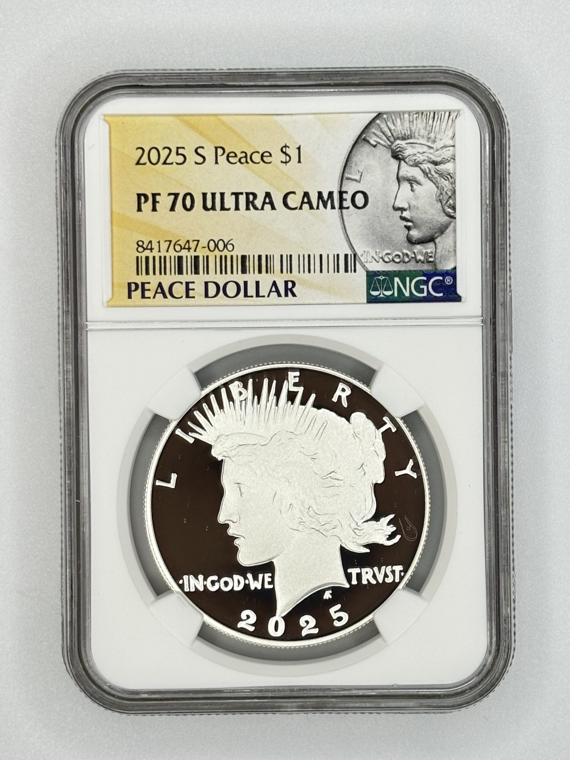 2025-S Morgan Dolar, y Peace Dollar cada una pesa 1oz. de Plata certificada con numero de registro de serie consecutiva.Ambas en PF7O ULTRA CAMEO.