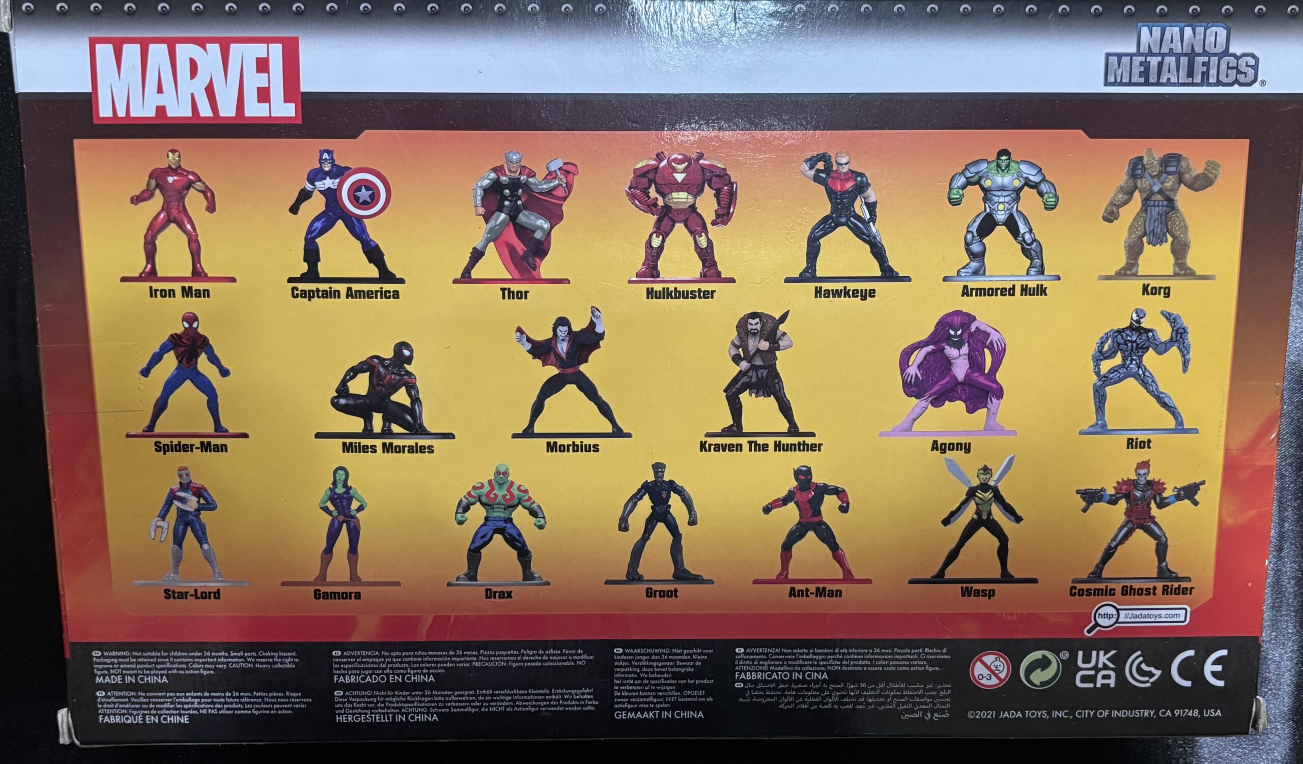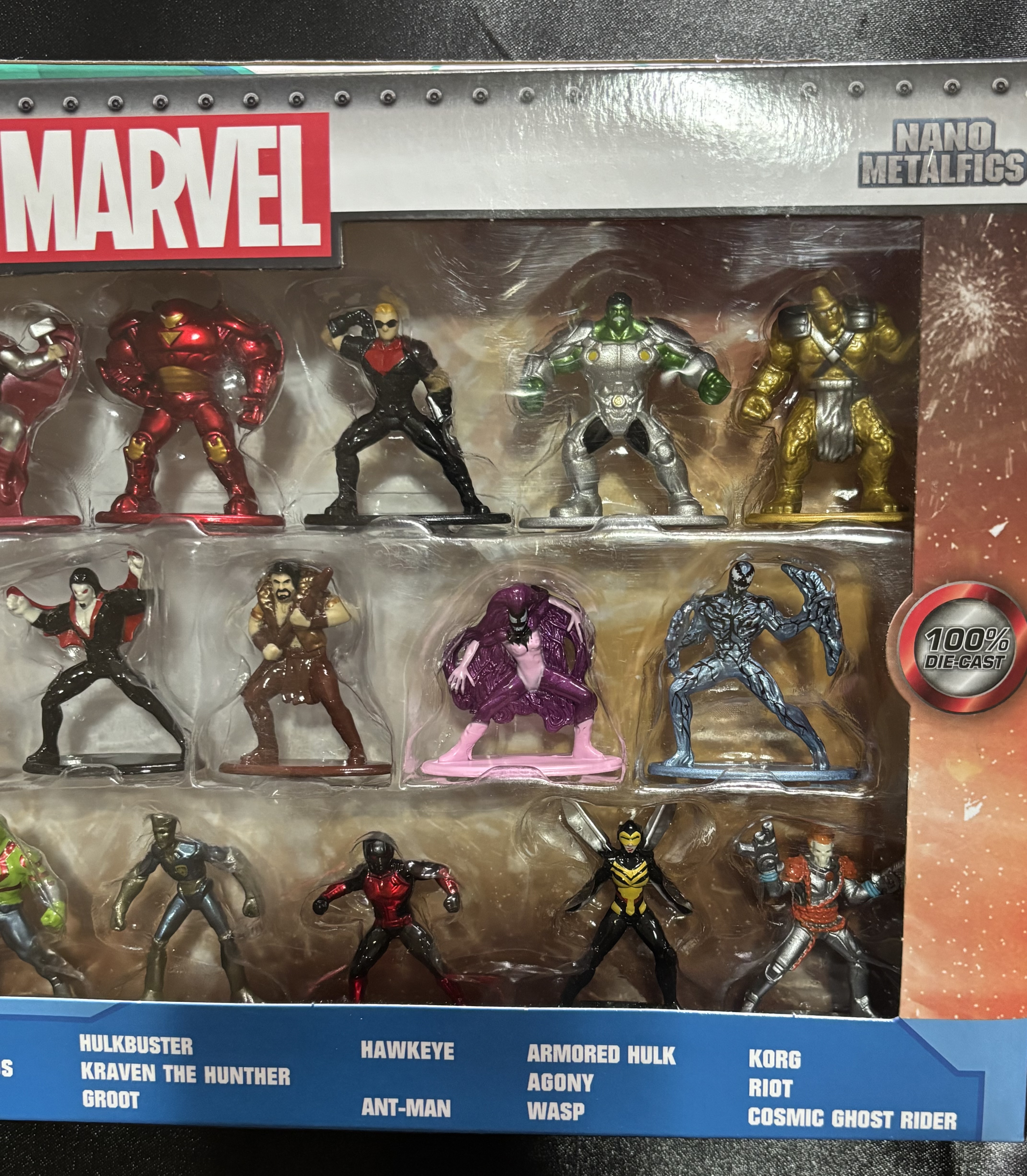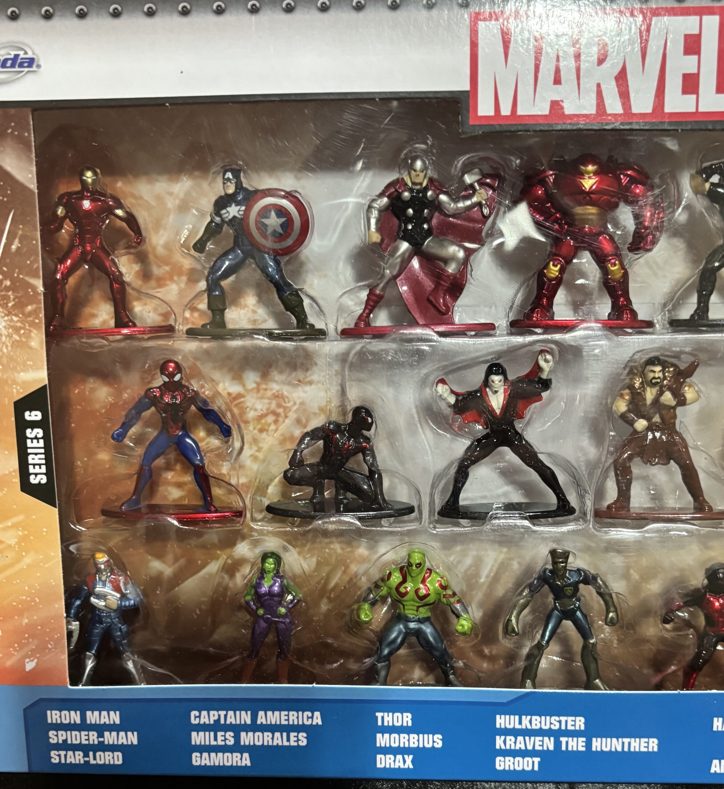 Nuevo en paquete, Jada Toys y Marvel, conjunto de 20 figuras de Nano Metal 100% de fundición a presión de la serie 6. Cada figura mide aproximadamente 1.65 pulgadas. Las 20 figuras incluyen: Iron Man, Capitán América, Thor, Hulkbuster, Hawkeye, Hulk Blindado, Korg, Spiderman, Miles Morales, Morbius, Kraven el Cazador, Agony, Riot, Star-Lord, Gamora, Drax, Groot, Ant-Man, Wasp y Cosmic Ghost Rider.